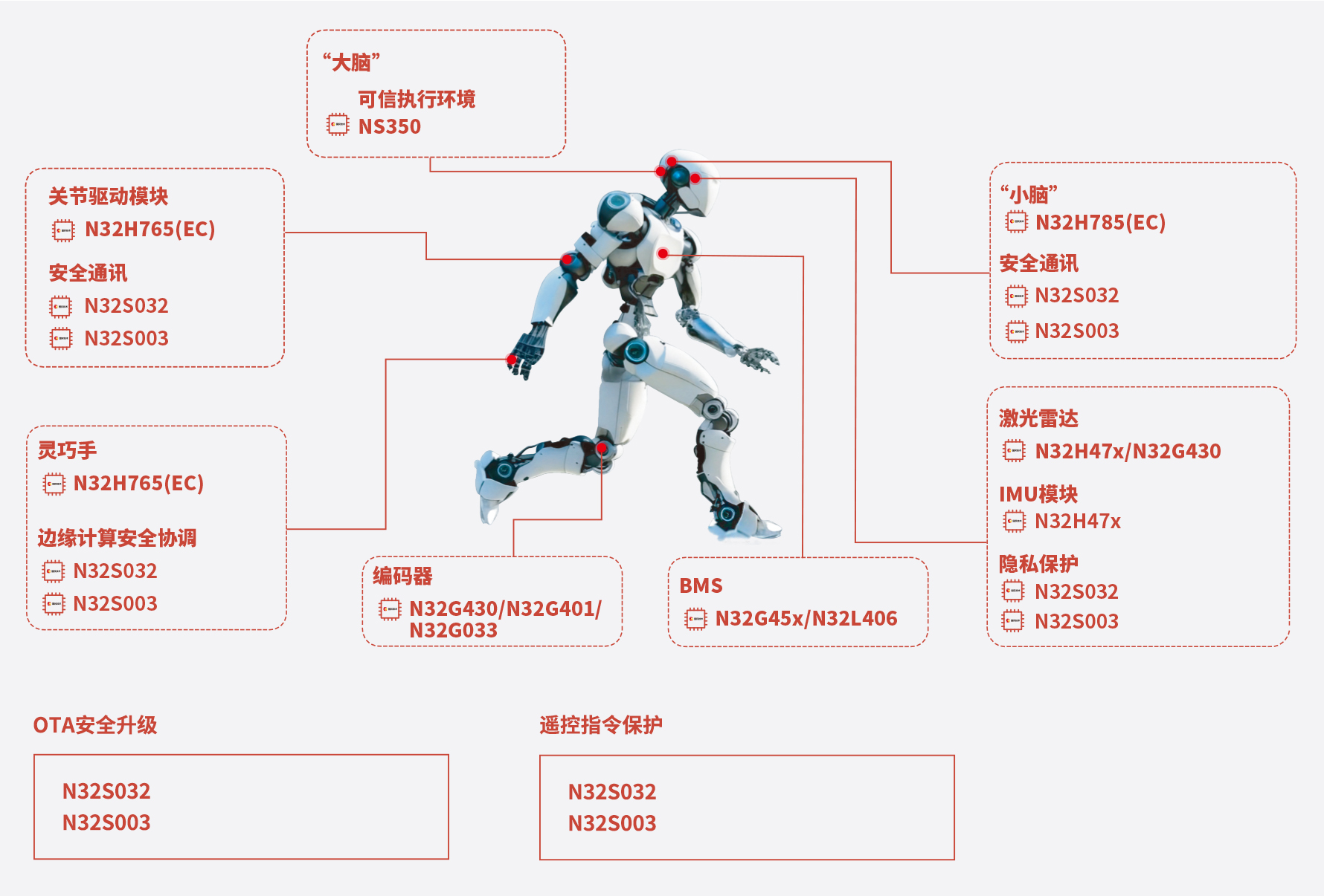 安全通讯/边缘计算安全协调/隐私保护/OTA安全升级/遥控指令保护:N32S032/N32S003